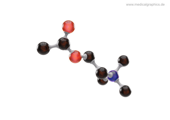 Illustration des Neurotransmitters Acetylcholin als Kugel-Stab-Modell auf weißem Hintergrund. Acetylcholin ist einer der wichtigsten Neurotransmitter im menschlichen Organismus und findet sich sowohl im zentralen als auch peripheren Nervensystem. Der Botenstoff wirkt an zwei Typen von Membranrezeptoren: dem muskarinergen und dem nikotinergen Acetylcholinrezeptor.