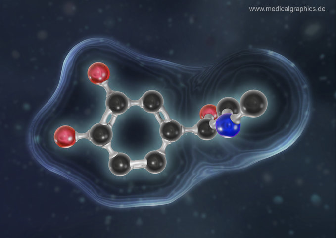 Illustration von Adrenalin (Epinephrin) in einer 3D Darstellung als Kugel-Stab-Modell mit angedeutetem Oberflächenmodell auf blauem Hintergrund. Adrenalin ist ein im Nebennierenmark gebildetes Hormon, das im Zentralnervensystem auch als Neurotransmitter fungiert. Als (Stress-)Hormon steigert Adrenalin die Herzfrequenz, erhöht den Blutdruck durch ein Zusammenziehen der Blutgefäße, es weitet die Bronchiolen und setzt Zucker aus der Leber frei, um Muskeln schneller mit Energie zu versorgen.