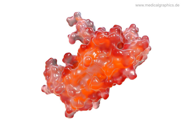 Illustration des menschliches Interferons alpha-2a als gläsernes Oberflächenmodell mit angedeuteten, tieferliegenden Bändermodell auf weißem Hintergrund. Alpha-Interferon wird von vielen Zelltypen gebildet als Antwort auf die Erkennung viraler oder bakterieller Nukleinsäure. Es aktiviert umliegende Zellen, in denen Proteine gebildet werden, die eine weitere (Virus-)Proteinsynthese in jenen Zellen hemmen und den Abbau von viraler und zellulärer RNA befördern. Die Illustration basiert auf Strukturdaten von Klaus, W., Gsell, B., Labhardt, A.M., Wipf, B., Senn, H.