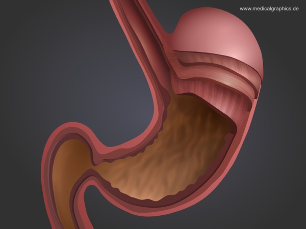 Anatomischer Aufbau des Magens in einer Schnitt-Ansicht. Teile der vorderen Magenwand wurden entfernt, um einen Blick ins Innere des Organs werfen zu können.