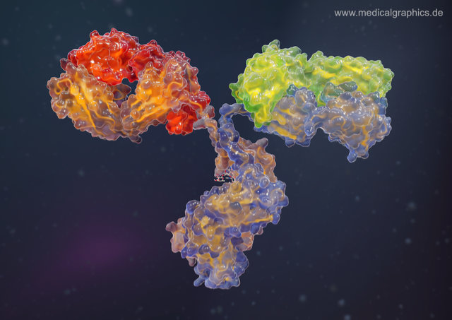 Illustration eines Antikörpers (Immunoglobulin) als gläsernes Oberflächenmodell mit angedeuteten, tieferliegenden Bändermodell auf dunklem Hintergrund. Antikörper sind Proteine, die von den B-Lymphozyten produziert werden, um an Erreger oder Fremdstoffe zu binden und diese zu neutralisieren oder um weitere Maßnahmen des Immunsystems zu ermöglichen. Die Abbildung basiert auf Strukturdaten von Harris, L.J., Larson, S.B., Hasel, K.W., McPherson, A