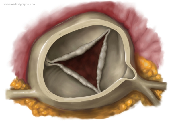 Illustration einer Insuffizienz der Aortenklappe, also der mangelnden Verschlussfähigkeit der Klappe. Hierdurch fließt ein Teil des Blutes aus der Aorta zurück in die linke Herzkammer, was die linken Herzhälfte übermäßig belastet. Ursache hierfür ist eine Endokarditis, also eine Entzündung der Herzinnenhaut. Nach abklingen der Entzündung können die Segel der Klappe so stark geschrumpft sein, dass ein Verschluss nicht mehr möglich ist und eine dreieckige Öffnung verbleibt.