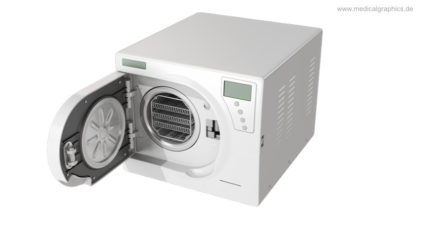 Illustration eines Autoklavs in Form eines Tischgeräts. Das Gerät dient im medizinischen Kontext dazu Instrumente und Textilien zu sterilisieren.
