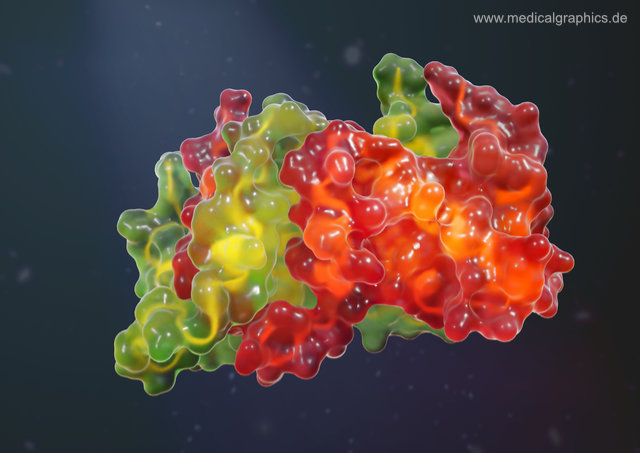 Illustration des menschliches Beta-Interferons als gläsernes Oberflächenmodell mit angedeuteten, tieferliegenden Bändermodell auf dunklem Hintergrund. Beta-Interferon wird von virusinfizierten Fibroblasten gebildet als Antwort auf die Erkennung viraler oder bakterieller Nukleinsäure. Es aktiviert umliegende Zellen, in denen Proteine gebildet werden, die eine weitere (Virus-)Proteinsynthese in jenen Zellen hemmen und den Abbau von viraler und zellulärer RNA befördern. Die Illustration basiert auf Strukturdaten von Karpusas, M., Nolte, M., Benton, C.B., Meier, W., Lipscomb, W.N., Gölz, S.