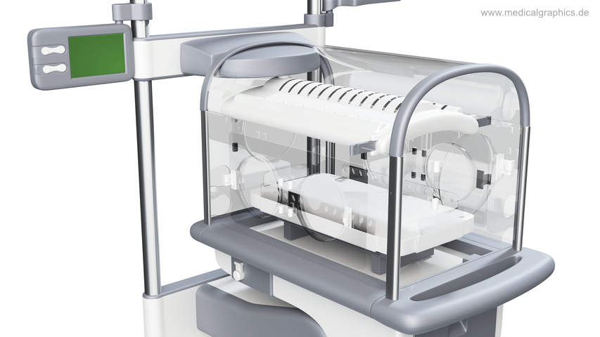 Illustration eines geschlossenen Brutkastens zur Pflege von Frühgeborenen und schwer erkrankten Neugeborenen. Das Gerät ermöglicht unter anderem die Sauerstoffzufuhr, Überwachung der Vitalfunktionen und den Schutz vor Kälte und Infektionen des Neugeborenen.