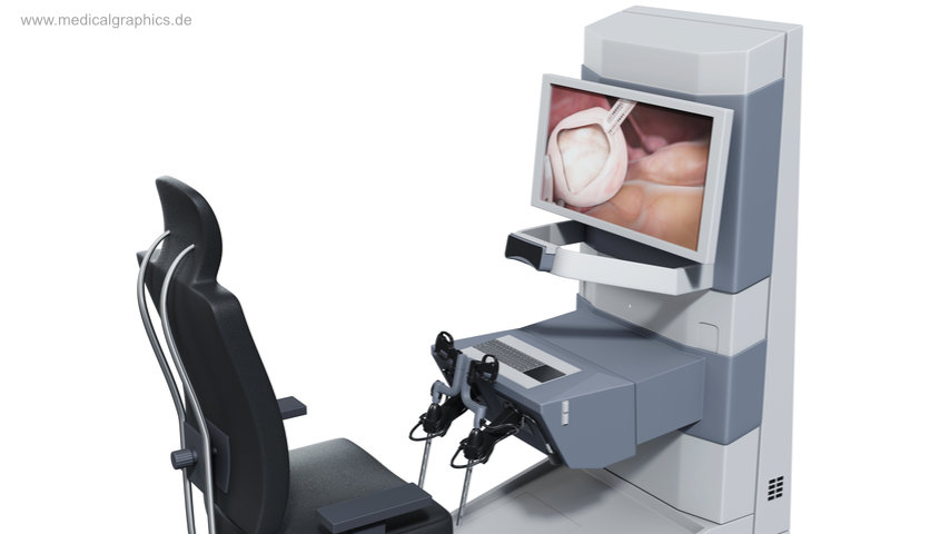 Illustration des Steuergerätes (Cockpit) eines Chirurgieroboters zum Einsatz bei laparoskopischen Eingriffen. Der Chirurg steuert die Kamera im Bauch des Patienten über seine Augenbewegungen – die Instrumente werden mit den Händen und Füßen gesteuert. Ein Filter bei der Übertragung der Bewegungen entfernt das natürliche Zittern der Hand des Chirurgen und sorgt für eine höhere Genauigkeit.