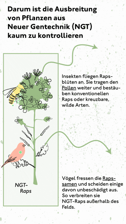 Die Grafik illustriert, warum die Ausbreitung von Pflanzen aus Neuer Gentechnik kaum zu kontrollieren ist. Die Rapsblüte wird von Bestäubern wie z.B. Bienen als Nektar- und Pollenquelle genutzt. Bei dem Besuch der Blüte bleiben Pollen des NGT-Rapses an den Bienen hängen. Die Bienen fliegen zur nächsten Blüte und verbreiten so die Pollen – auch auf benachbarte Felder, auf denen konventioneller Raps wächst. Dadurch kann konventioneller Raps mit Pollen des NGT-Rapses befruchtet werden. Es entstehen Rapssamen und daraus Pflanzen mit gemischtem Erbgut (halb konventionell/halb NGT). Die Rapssamen werden von Vögeln wie z.B. Finken als Nahrungsquelle genutzt. Ein Teil der Samen des NGT-Rapses kann die Verdauung unbeschädigt passieren. Die Vögel fliegen davon und der NGT-Rapssamen kann auch außerhalb des Feldes auf dem Boden landen. So kann irgendwo in der Natur ein NGT-Rapssamen keimen und zur NGT-Rapspflanze heranwachsen. Diese können sich auch mit anderen NGT-Rapspflanzen und anderen verwandten Pflanzenarten kreuzen. Die Verbreitung von NGT-Raps ist kaum kontrollierbar, sobald der NGT-Raps angebaut wird.