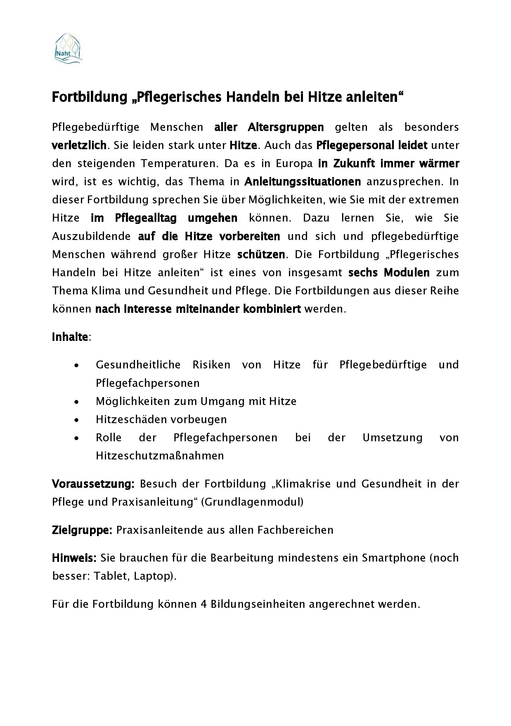 Die Datei ist Teil des NahtToolkit und gehört zum Vertiefungsmodul „Pflegerisches Handeln bei Hitze anleiten“. Das Naht Toolkit hat die Qualifizierung von Praxisanleitenden in Pflegeberufen zum Ziel. Praxisanleitende erhalten hier gezielte Informationen, um Nachhaltigkeit in ihre Praxisanleitung zu integrieren. Die Inhalte des NahtToolkit können in bestehende Fort- und Weiterbildungen integriert werden. Es handelt sich hierbei um einen Werbetext der für die Fortbildung verwendet werden kann.
