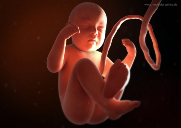 Illustration eines menschlichen Fötus mit Nabelschnur im Mutterleib von vorne.