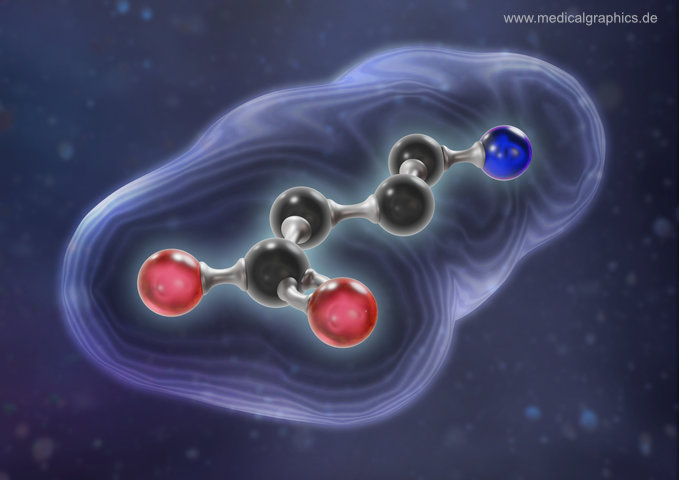 Illustration von Gamma-Aminobuttersäure (GABA) als Kugel-Stab-Modell mit angedeutetem Oberflächenmodell auf blauem Hintergrund. GABA ist der hauptsächliche Neurotransmitter von inhibitorischen (hemmenden) Synapsen im Gehirn und beteiligt an der Steuerung des Schlaf-Wach-Rhythmus und der Bildung von Wachstumshormonen. Zudem hat Gamma-Aminobuttersäure eine beruhigende Wirkung und kann als körpereigenes Anti-Stress-Mittel bezeichnet werden.
