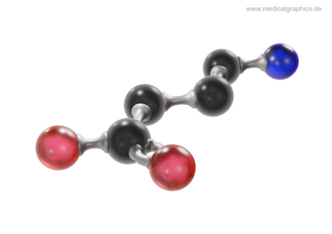 Illustration von Gamma-Aminobuttersäure (GABA) als Kugel-Stab-Modell auf weißem Hintergrund. GABA ist der hauptsächliche Neurotransmitter von inhibitorischen (hemmenden) Synapsen im Gehirn und beteiligt an der Steuerung des Schlaf-Wach-Rhythmus und der Bildung von Wachstumshormonen. Zudem hat Gamma-Aminobuttersäure eine beruhigende Wirkung und kann als körpereigenes Anti-Stress-Mittel bezeichnet werden.