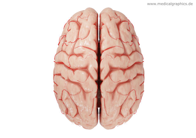 Illustration eines menschlichen Gehirns mit Arterien. In dieser Ansicht sind die linke und rechte Gehirnhälfte erkennbar.