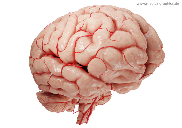Illustration eines menschlichen Gehirns mit Arterien von rechts vorne.