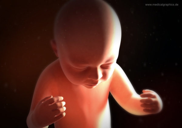 Illustration des Gesichts eines menschlichen Fötus im Mutterleib von oben.