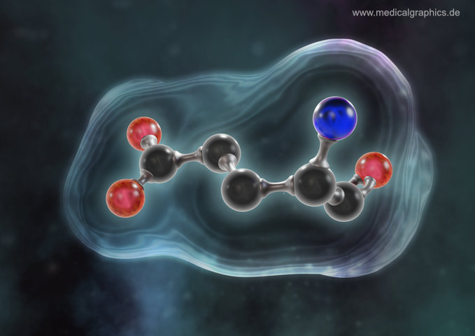 Illustration von Glutamat in einer 3D Darstellung als Kugel-Stab-Modell mit angedeutetem Oberflächenmodell auf türkisem Hintergrund. Glutamat ist eine Form der Glutaminsäure und einer der wichtigsten erregenden Neurotransmitter im zentralen Nervensystem (ZNS). Glutamat spielt eine wichtige Rolle bei Sinneswahrnehmungen, Ausführung von Bewegungen, höheren Gehirnfunktionen und Regulierung des Hungergefühls.