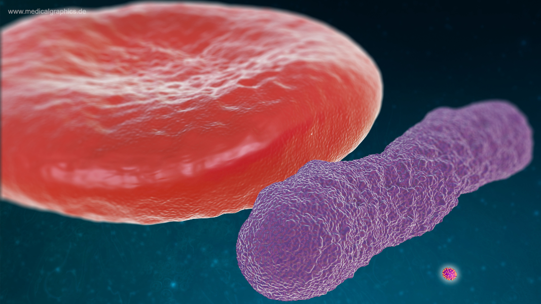 Größenvergleich: Erythrozyt, Bakterium und Virus