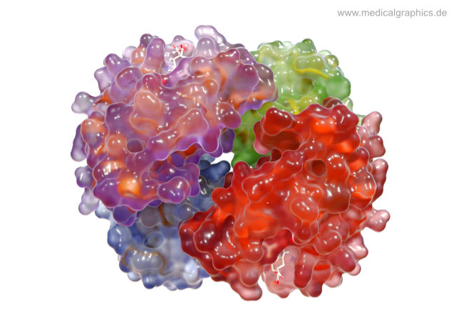 Illustration des Hämoglobins (Deoxyhämoglobin) als gläsernes Oberflächenmodell mit angedeuteten, tieferliegenden Bändermodell und Teilen als Stäbchenmodell auf weißem Hintergrund. Hämoglobin ist der Proteinkomplex der roten Blutkörperchen (Erythrozyten), dessen Aufgabe es ist Sauerstoff und Kohlenstoffdioxid zu bindet und so im Blutkreislauf zu transportieren. Die Illustration basiert auf Strukturdaten von Perutz, M.F.
