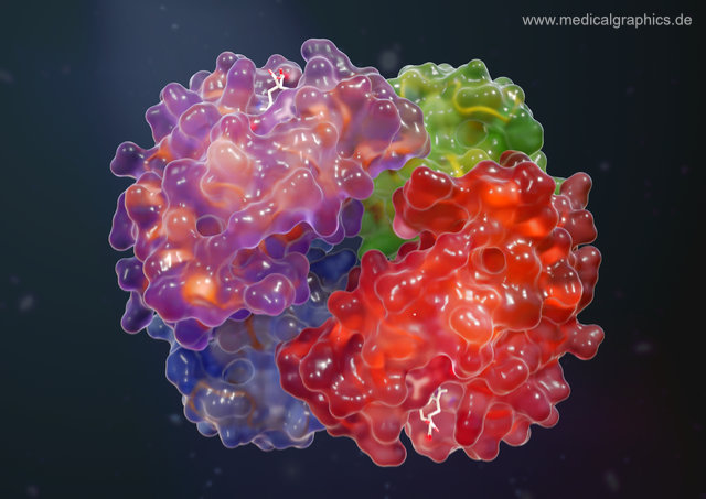 Illustration des Hämoglobins (Deoxyhämoglobin) als gläsernes Oberflächenmodell mit angedeuteten, tieferliegenden Bändermodell und Teilen als Stäbchenmodell auf dunklem Hintergrund. Hämoglobin ist der Proteinkomplex der roten Blutkörperchen (Erythrozyten), dessen Aufgabe es ist Sauerstoff und Kohlenstoffdioxid zu bindet und so im Blutkreislauf zu transportieren. Die Illustration basiert auf Strukturdaten von Perutz, M.F.