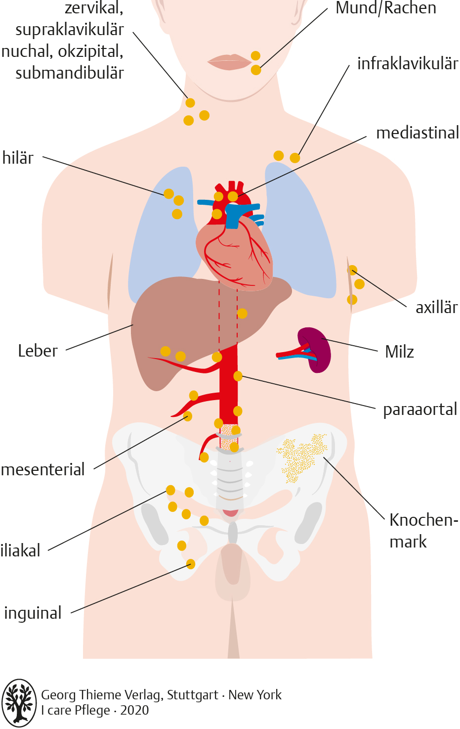 I care Krankheitslehre | Spezielle Krankheitslehre | Lokalisation der Lymphknotenschwellungen bei malignen Lymphomen (Grafik)