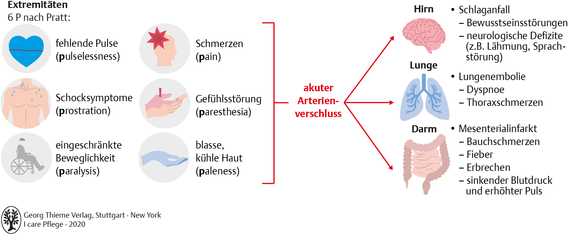 Das Schaubild zeigt die Symptome (6P nach Pratt), die auf einen akuten Arterienverschluss in Hirn, Lunge oder Darm hinweisen können: fehlender Puls, Schmerzen, Schocksymptome, Gefühlsstörung, eingeschränkte Beweglichkeit und blasse, kühle Haut.