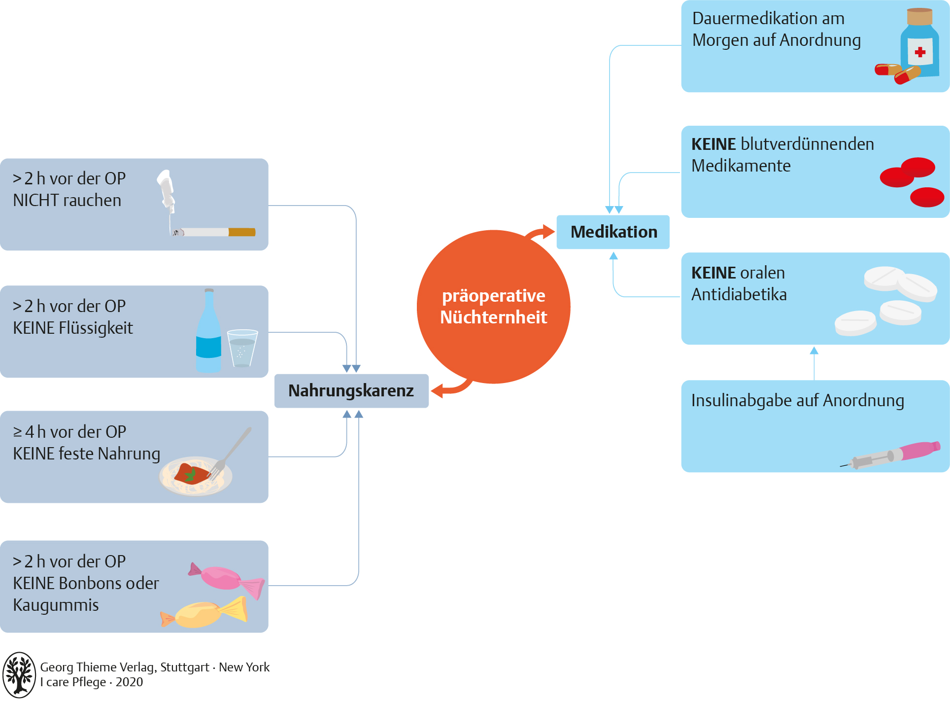 Auf dieser Grafik ist zu sehen, welche Maßnahmen zur präoperativen Nüchternheit gehören; aufgeteilt in Nahrungskarenz und Medikation.