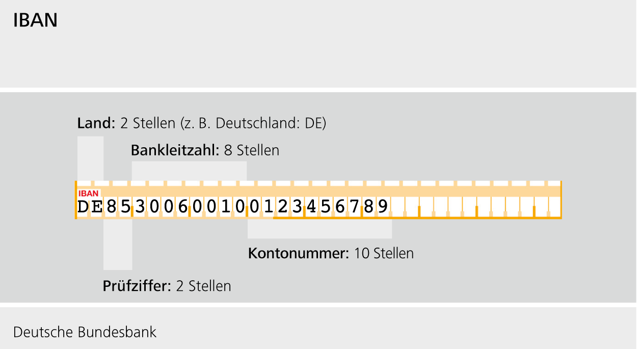 Diese Datei zeigt eine Veranschaulichung, wie die IBAN aufgebaut ist und aus welchen Informationen sie zusammengesetzt wird. Die Infografik ist dem Buch "Geld- und Geldpolitik" entnommen. Sie steht im PNG-Format zur Verfügung, wodurch sie in viele Dokumentformate eingefügt werden kann.