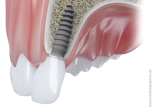 Illustration eines dentalen Implantats eines Schneidezahns im Oberkiefer. Der Oberkiefer wird in einem Sagittalschnitt gezeigt, um die Verschraubung des Implantats im Knochengewebe veranschaulichen zu können.