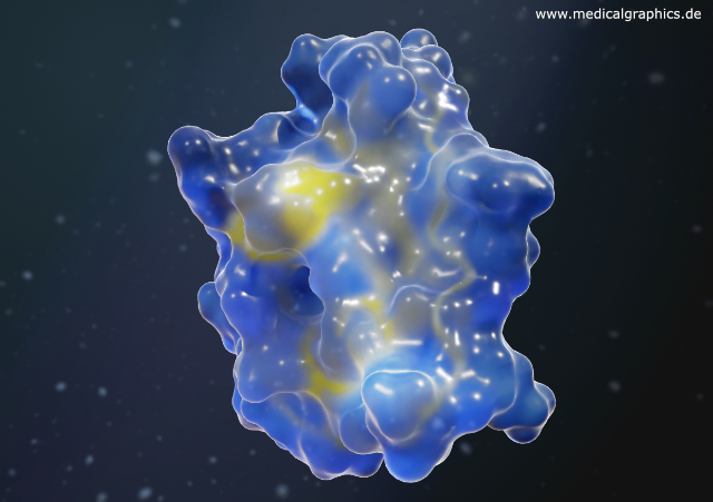 Illustration eines Insulin Hormons als gläsernes Oberflächenmodell mit angedeuteten, tieferliegenden Bändermodell auf dunklem Hintergrund. Insulin ist ein Hormon, das in den ß-Zellen der Langerhans-Inseln in der Bauchspeicheldrüse gebildet wird. Wird Insulin ausgeschüttet werden die Zellen des Körpers angeregt Glucose aus dem Blut aufzunehmen, womit der Blutzuckerspiegel gesenkt wird. Diese Illustration basiert auf Strukturdaten von Hua, Q.X., Gozani, S.N., Chance, R.E., Hoffmann, J.A., Frank, B.H., Weiss, M.A.