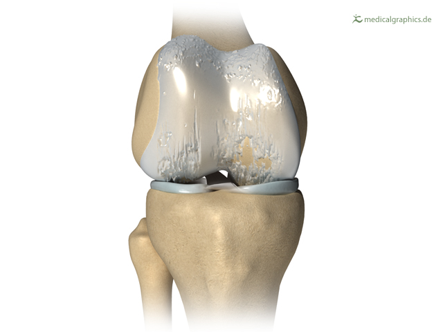 Die Illustration zeigt ein Knie von frontal mit folgenden Strukturen: Oberschenkelknochen, Wadenbein, Schienenbein. teilweise regenerierter Gelenkknorpel, zurückgebildete Entzündung des Gelenks