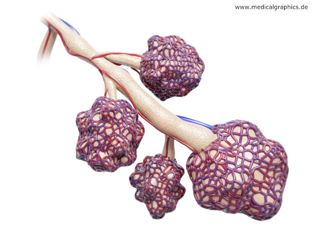 Illustration eines Lungenemphysems auf Ebene der Alveolen und Bronchiolen. Dieses Emphysem ist das Ergebnis verschiedener Lungenerkrankungen (wie z. B. COPD). Hierbei sind die Lungenbläschen (Alveolen) überdehnt und teilweise zerstört und dadurch in ihrer Funktion beeinträchtigt.