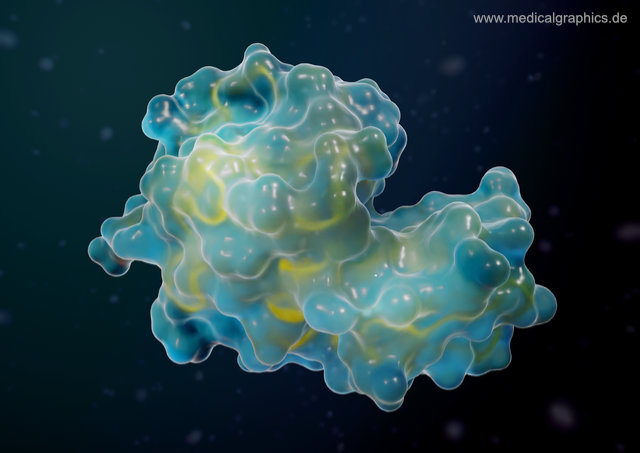 Illustration eines Lysozyms als gläsernes Oberflächenmodell mit angedeuteten, tieferliegenden Bändermodell auf dunklem Hintergrund. Das Lysozym ist ein Enzym des angeborenen Immunsystems und dient der Abwehr von Bakterien. Die Illustration basiert auf Strukturdaten von Diamond, R., Phillips, D.C., Blake, C.C.F., North, A.C.T.