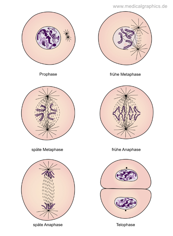 Illustrationen zu den einzelnen Phasen der Mitose.