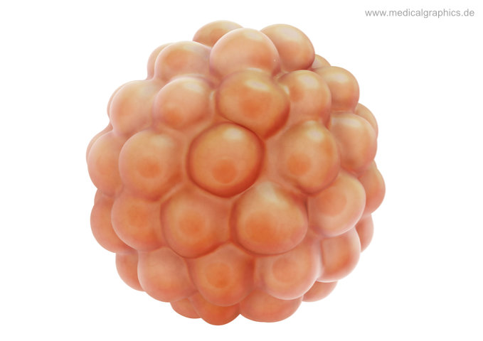 Illustration einer Morula auf weißem Hintergrund ca. 96 Stunden nach der Befruchtung. Die Morula befindet sich zu diesem Zeitpunkt der Embryogenese in der Regel im Eileiter und eine erste Differenzierung der Zellen beginnt.