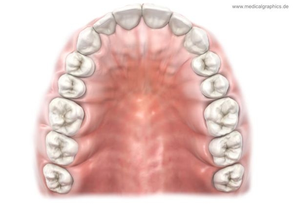 Oberkiefer mit Gaumen, Zahnfleisch und Zähnen.