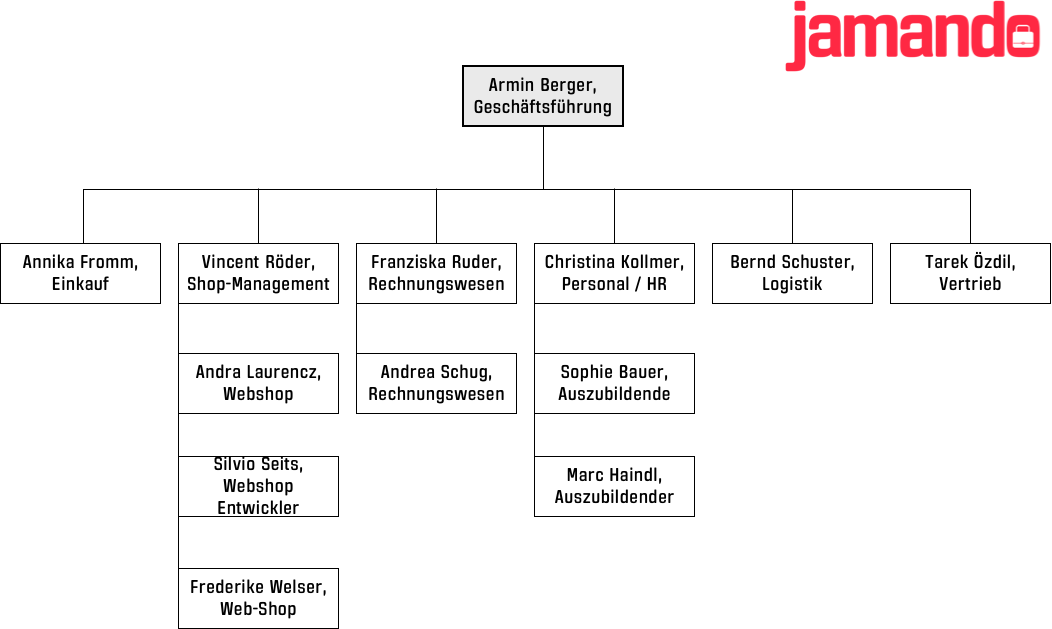 Die Datei zeigt das Organigramm der fiktiven Firma Jamando mit Namen und Stellenbezeichnung.