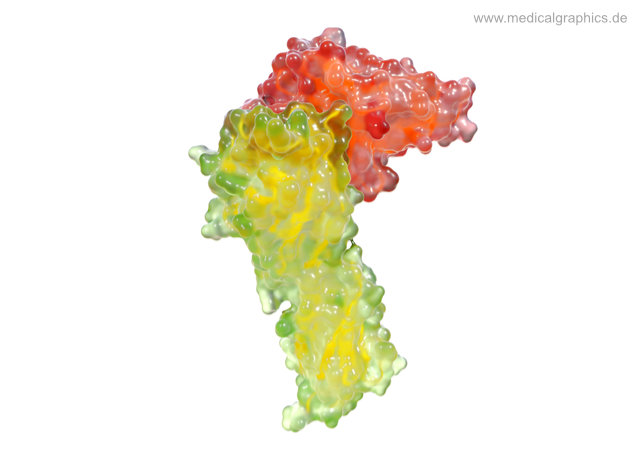 Illustration der Bindung des Oberflächenproteins PD-L1 an PD-1 als gläsernes Oberflächenmodell mit angedeuteten, tieferliegenden Bändermodell auf weißem Hintergrund. Programmed cell death 1 ligand 1 ist zusammen mit dem Rezeptor PD-1 an der Hemmung der Immunantwort beteiligt. PD-1 (rot) findet sich auf der Oberfläche von T-Zellen und interagiert mit dem Ligandenprotein PD-L1, welches sich auf der Oberfläche von regulatorischen Zellen befindet, wie z. B. auf den Zellen, die Antigene von Eindringlingen präsentieren. Die Illustration basiert auf Strukturdaten von Lin, D.Y., Tanaka, Y., Iwasaki, M., Gittis, A.G., Su, H.P., Mikami, B., Okazaki, T., Honjo, T., Minato, N., Garboczi, D.N.