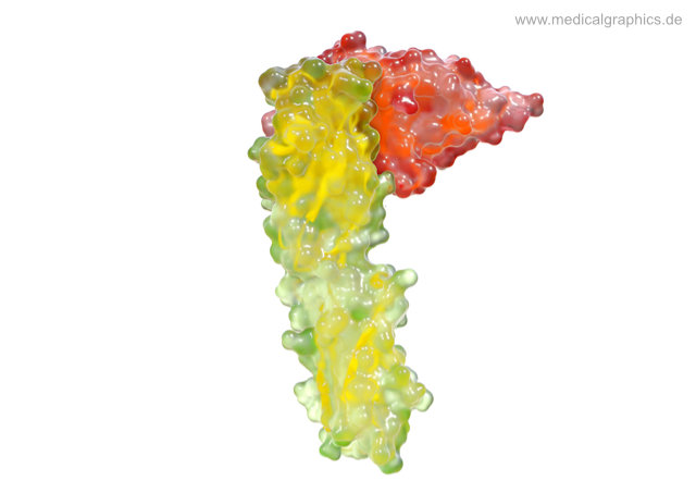 Illustration der Bindung des Oberflächenproteins PD-L2 an PD-1 als als gläsernes Oberflächenmodell mit angedeuteten, tieferliegenden Bändermodell auf weißem Hintergrund. Programmed cell death 1 ligand 2 ist zusammen mit dem Rezeptor PD-1 an der negativen Regulierung der adaptiven Immunantwort beteiligt. PD-1 (rot) findet sich auf der Oberfläche von T-Zellen und interagiert mit dem Ligandenprotein PD-L2, welches sich auf der Oberfläche von regulatorischen Zellen befindet, wie z. B. auf den Zellen, die Antigene von Eindringlingen präsentieren. Die Illustration basiert auf Strukturdaten von Yan, Q., Lazar-Molnar, E., Cao, E., Ramagopal, U.A., Toro, R., Nathenson, S.G., Almo, S.C.