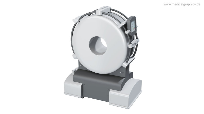 Illustration eines mobilen CT-Scanners für die Schädeltomographie zum Einsatz in der Intensivmedizin, im Operationssaal, in der Notaufnahme und im Klinikalltag.
