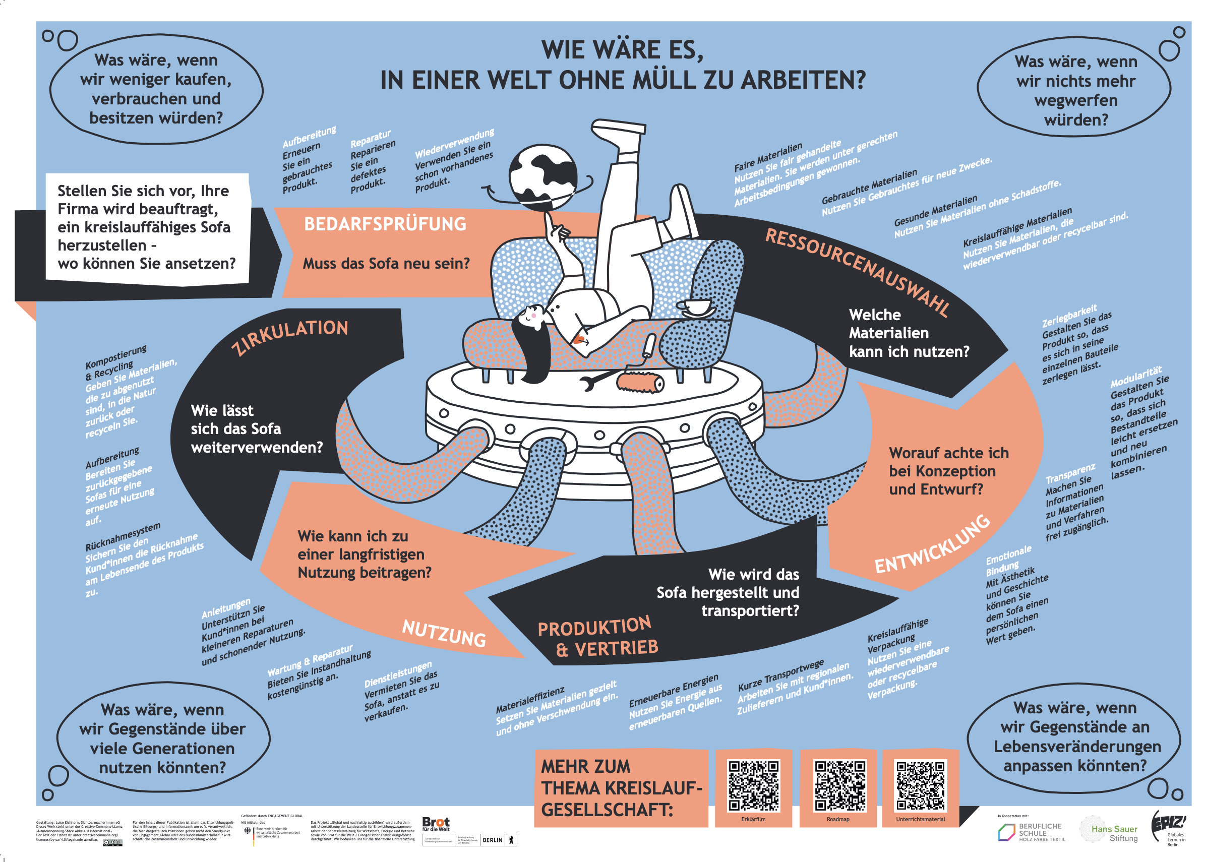 Wie wäre es, in einer Welt ohne Müll zu arbeiten? Unter dieser Überschrift stellt dieses Poster das Konzept der Kreislaufwirtschaft dar. Es gibt konkrete Anregungen zu kreislauffähigem und nachhaltigem Design, Produktion und Zirkulation von Produkten, stellt Reflexionsfragen und regt zum Weiterdenken an. Das Poster eignet sich als niedrigschwelliger Gesprächsanlass im Klassenzimmer und für den Einsatz im Unterricht. Das Poster wurde in Zusammenarbeit mit der Hamburger Berufsschule Holz Farbe Textil und der Hans-Sauer-Stiftung erarbeitet. Das Poster gehört zu der Broschüre „Arbeits- und Geschäftsprozesse zirkulär gestalten“.