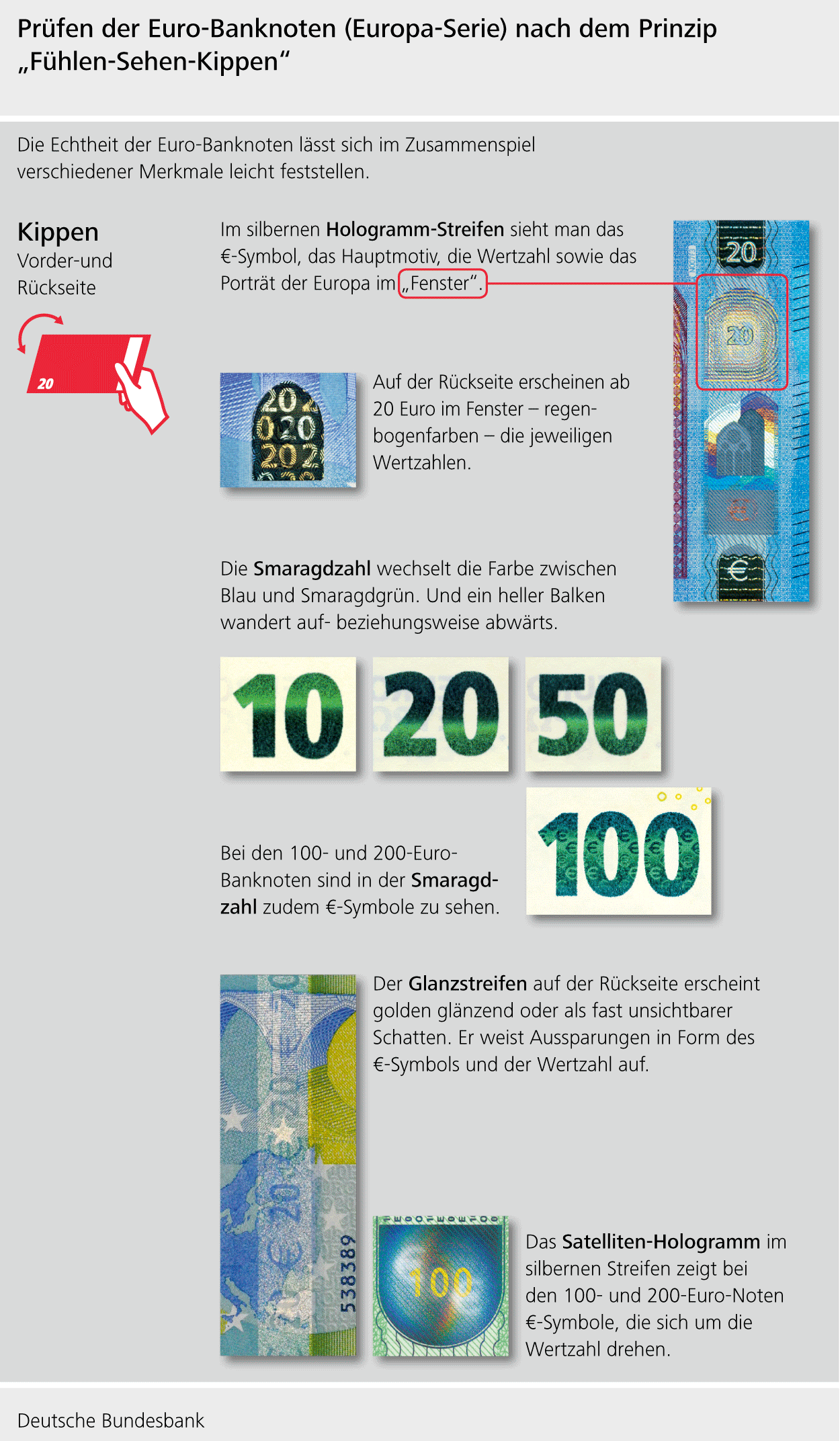 Diese Datei einhält eine Veranschaulichung, wie Euro-Banknoten der Europa-Serie nach dem Prinzip "Fühlen-Sehen-Kippen" geprüft werden können. In diesem Teil werden die Prüfmerkmale durch Kippen vorgestellt. Die Infografik ist dem Buch "Geld- und Geldpolitik" entnommen. Sie steht im PNG-Format zur Verfügung, wodurch sie in viele Dokumentformate eingefügt werden kann.