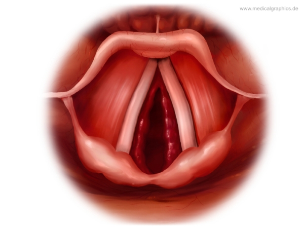 Illustration einer Laryngitis subglottica (Pseudo-Krupp). Die Laryngitis subglottica wird durch eine Virusinfektion der oberen Atemwege ausgelöst und betrifft vor allem Babys und Kleinkinder. Die Grafik zeigt die durch die Infektion entzündete Schleimhaut unterhalb der Stimmbänder, was zu einer Verengung der Atemwege führt.