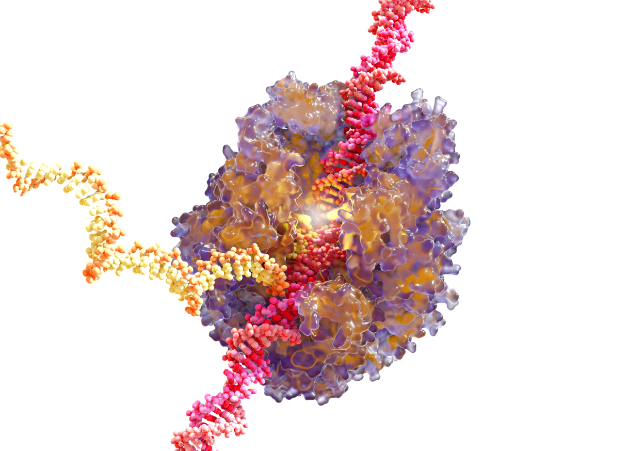 Illustration einer RNA-Polymerase als gläsernes Oberflächenmodell mit angedeuteten, tieferliegenden Bändermodell auf weißem Hintergrund. Die RNA-Polymerase ist ein Enzym, das RNA aus einer DNA-Vorlage synthetisiert. Sie besteht aus verschiedenen Proteinen, welche die DNA-Stränge (rot) umhüllt, abwickelt und auf der Grundlage der in der DNA enthaltenen Informationen einen RNA-Strang (gelb) synthetisiert. Diese Illustration basiert auf Strukturdaten von Gnatt, A.L., Cramer, P., Kornberg, R.D.