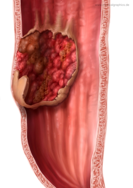 Illustration eines Karzinoms im Ösophagus (Speiseröhrenkrebs). Die Speiseröhre ist mit einem Schnitt durch die Frontalebene geöffnet und zeigt einen geschwürigen Tumor (ulzerös).