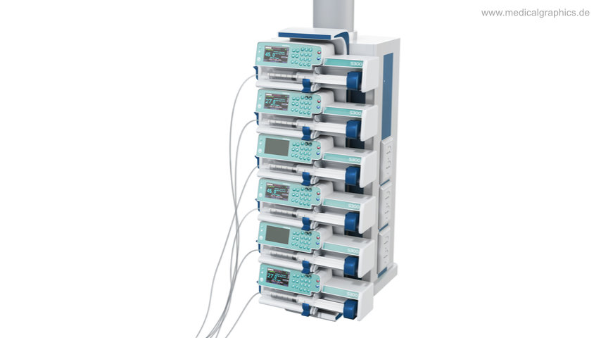 Illustration einer Spritzenpumpe für intravenöse und intraarterielle Infusionen sowie für die enterale Ernährung. Spritzenpumpen werden vor allem auf Intensivstationen eingesetzt und sorgen durch die kontinuierliche Abgabe für eine gleichbleibende Wirkstoffkonzentration im Blut. Auf einem integrierten Monitor können der Wirkstoff und dessen Abgabe vom Pflegepersonal überwacht werden.