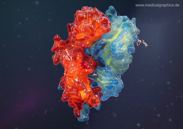 Illustration eines T-Zell-Rezeptors als gläsernes Oberflächenmodell mit angedeuteten, tieferliegenden Bändermodell auf dunklem Hintergrund. Der T-Zell-Rezeptor befindet sich auf der Oberfläche von T-Zellen und ist zuständig für die Erkennung von Antigenen, die von MHC-Molekülen präsentiert werden. Er kann körperfremde Antigene erkennen und in diesem Fall die T-Zelle aktivieren. Die Illustration basiert auf Strukturdaten von Garcia, K.C., Degano, M., Stanfield, R.L., Wilson, I.A.