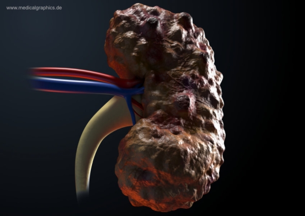 Illustration von einer Zystenniere (Polycystic Kidney Disease, PKD). Darstellung der äußerlichen Veränderungen des Nierenparenchym mit zahllosen Zysten.